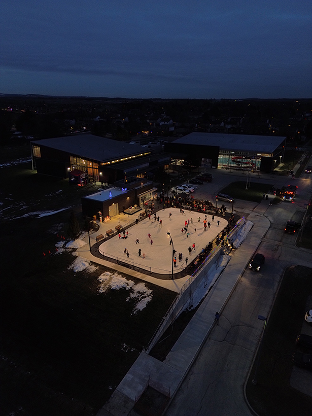 The Bowmanville refrigerated skating trail is part of the South Bowmanville Recreation Centre, currently under construction. The concrete surface of the outdoor skating trail will be designed for year-round use and serve as a year-round gathering space.